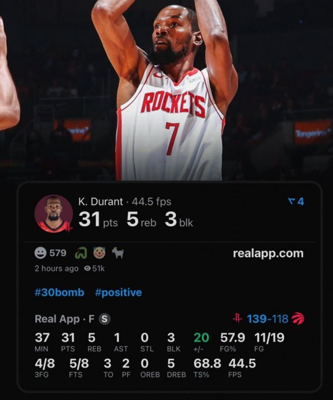 而在休斯顿火箭139-121大胜多伦多猛龙的比赛中,凯文·杜兰特再次证明了自己为何仍是联盟顶级的得分手。他全场19投11中,三分球8中4,罚球8中5,拿下31分5篮板1助攻3盖帽,正负值高达+20。