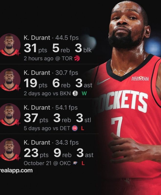 其次,这是杜兰特加盟火箭后,仅用前4场比赛就将总得分破100,火箭历史第二快,仅次于哈登(3场)。
